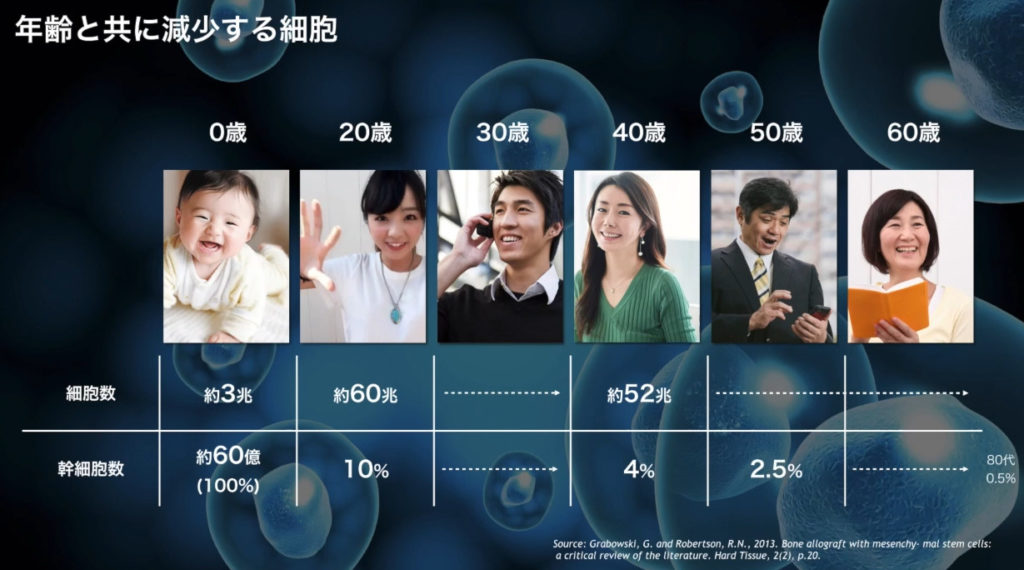というように、年齢とともに幹細胞の数が急激に目減りしていきます。